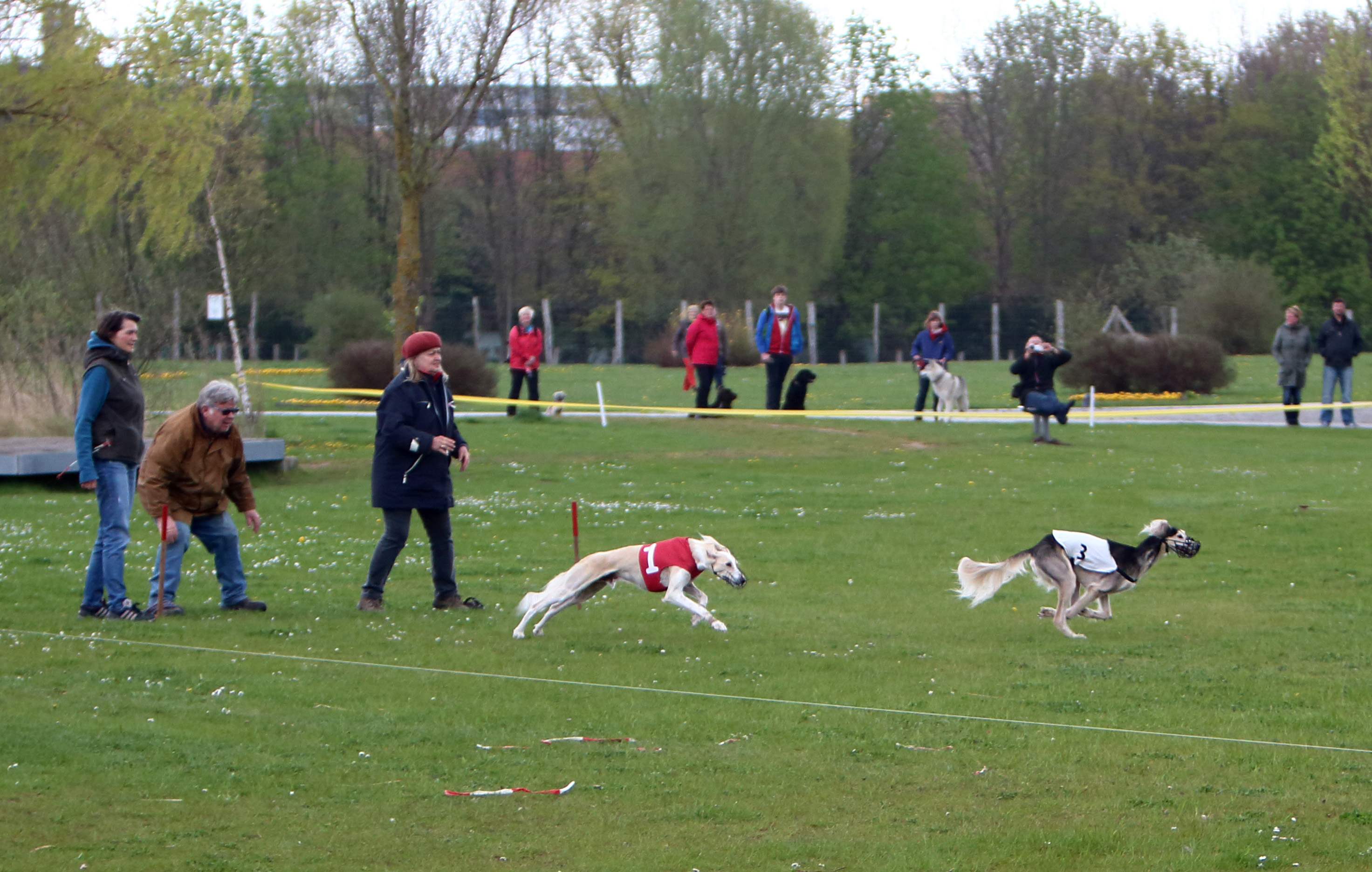 Als wir einige Jahre später unseren Hund in Rostock zum Coursing anmeldeten, konnten wir nicht ahnen, dass derselbe Hund (wie damals in Wismar) wieder mit Daoud laufen sollte. Unser Schlauberger muss ihn aber sofort erkannt haben. Im zweiten Durchgang hat Daoud wieder seinen eigenen Weg gefunden – nämlich den kürzeren und schnelleren, was natürlich Punktabzug bedeutete.