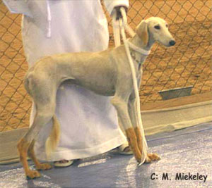 Fig. 4: A desert bred smooth saluki at the 1st Saluki Beauty Contest 2006 in Abu Dhabi with henna on his legs.