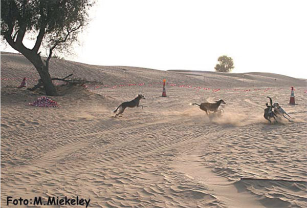 During recent years, I have visited the United Arab Emirates often and could admire many different Saluki-types with a suspected diverse genome, They should be seen as a “treasure-house” for genetic resource. Genetically, it is of high concern to perpetuate real desert-bred Salukis in the countries of origin because it is there that these hounds will likely be tested for their natural abilities of the breed’s “Ancient Heritage”, I note fortunately that I have not seen in the UAE Salukis with exaggerated breeding forms, e.g. with over-angulated rears, with a falling back or a swan-neck. Obviously some of the Salukis are still be used for chasing as demonstrated by their cropped ears and henna on their legs. If these imports may have for our taste - an “unnoble head”, a lack of elegance in conformation, or a few markings which may not correspond to the European standard, compare them to the western hounds with those breeding exaggerations in the phenotype which do not correspond to the standard that much or that little either. Breeding on excessive traits, which are of no importance for the function, affects the health of the animal. The phenotype and the genes always correspond to each other (Dan Belkin 1993). In the age of globalisation we should appreciate to opportunities to have an exchange of experiences and also of genes between Occident and Orient.