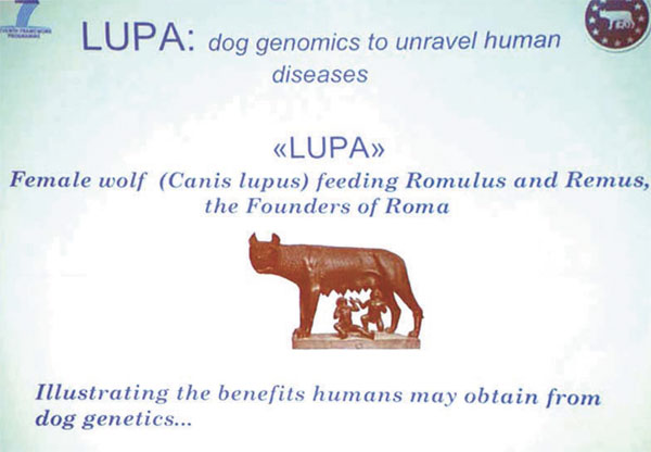 LUPA reflects the companionship between dogs/wolves and humans, as Romulus and Remus - the founders of Roma who survived by being fed by a female wolf. Why are scientists simultaneously studying diseases in dogs? Humans and dogs share a very similar genome and develop the same diseases. Doing research on dog diseases gives information about human diseases and vice versa. Further, dogs have a unique population history (pedigrees) and breed structure as well as a short life span. Dogs can simplify the genetic studies on humans. Dogs are ideal to make studies on phenotypic variability in size, colour, behaviour and character. Hounds became superior companion for human geneticists, so they are certainly more than “man’s best friend”.